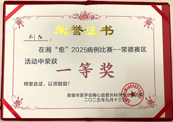 近日,由湖南省醫(yī)學(xué)會(huì)心胸外科專業(yè)委員會(huì)主辦的“肺行沅澧走進(jìn)安鄉(xiāng)”湘“愈”2025病例比賽(常德賽區(qū))在安鄉(xiāng)縣人民醫(yī)院圓滿落幕。湘雅常德醫(yī)院心胸外科劉陽醫(yī)生斬獲一等獎(jiǎng)。