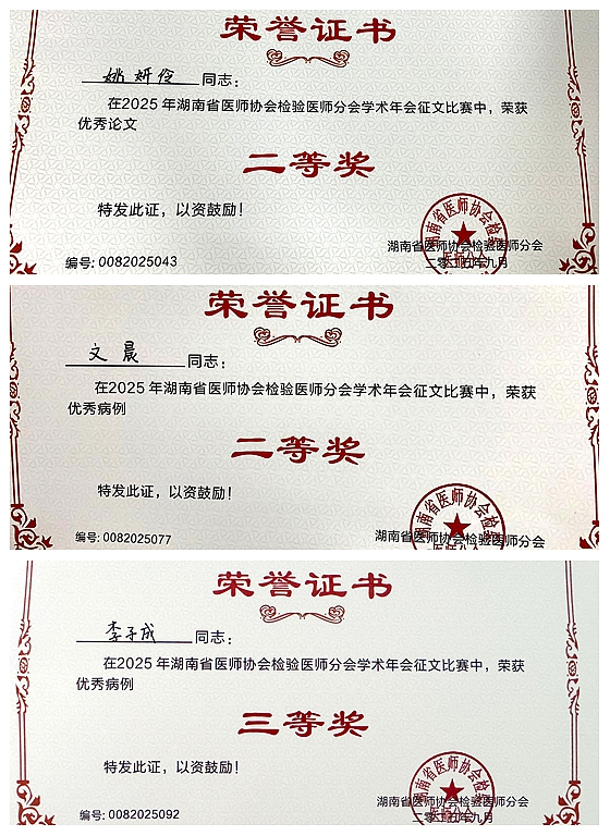 會上,湘雅常德醫(yī)院檢驗科團隊表現(xiàn)突出,一舉斬獲多項省級榮譽:在大會優(yōu)秀論文評選環(huán)節(jié)中,檢驗科姚妍伶榮獲優(yōu)秀論文二等獎的優(yōu)異成績;在臨床病例競賽項目中,檢驗科文晨、李子成分別獲得臨床病例二等獎和三等獎的好成績。