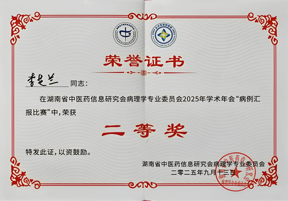 近日,湖南省中醫(yī)藥信息研究會病理學專業(yè)委員會2025年學術年會暨病理技術學組會議在省會長沙成功舉辦。本次年會匯聚了來自省內外共150余名病理專家學者進行學術交流,會議期間同步舉辦了病理醫(yī)師病例匯報比賽。湘雅常德醫(yī)院病理科李芝蘭主治醫(yī)師以《迷霧中的小息肉,一把分子鑰匙鎖定腸道腫瘤真兇》為題參賽,詳細介紹了一例罕見的原發(fā)于胃腸道腺泡狀軟組織肉瘤的診斷歷程。她憑借扎實的功底、縝密的思維、清晰的表述及提問式的演講,充分調動了現(xiàn)場氣氛,獲得一致好評,最終攬獲病例匯報比賽“二等獎”。