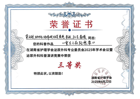 近日,由中南大學湘雅二醫(yī)院主辦的湖南省護理學會泌尿外科專業(yè)委員會2025年學術會議暨泌尿外科科普講解競賽活動在湖南長沙順利舉辦。湘雅常德醫(yī)院泌尿外科團隊創(chuàng)作的作品《重生之尿路感染》憑借扎實的專業(yè)內容與創(chuàng)新的表現(xiàn)形式,從106個參賽作品中脫穎而出,一舉斬獲大賽三等獎。